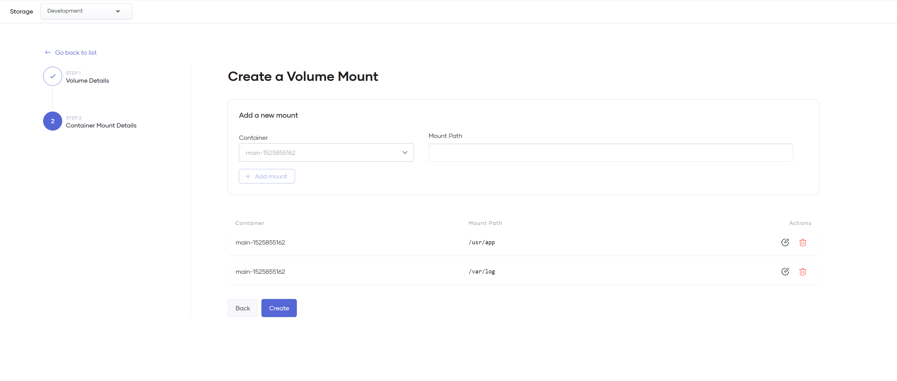 Click Create. This applies the volume mount immediately to your container and triggers a rolling restart.