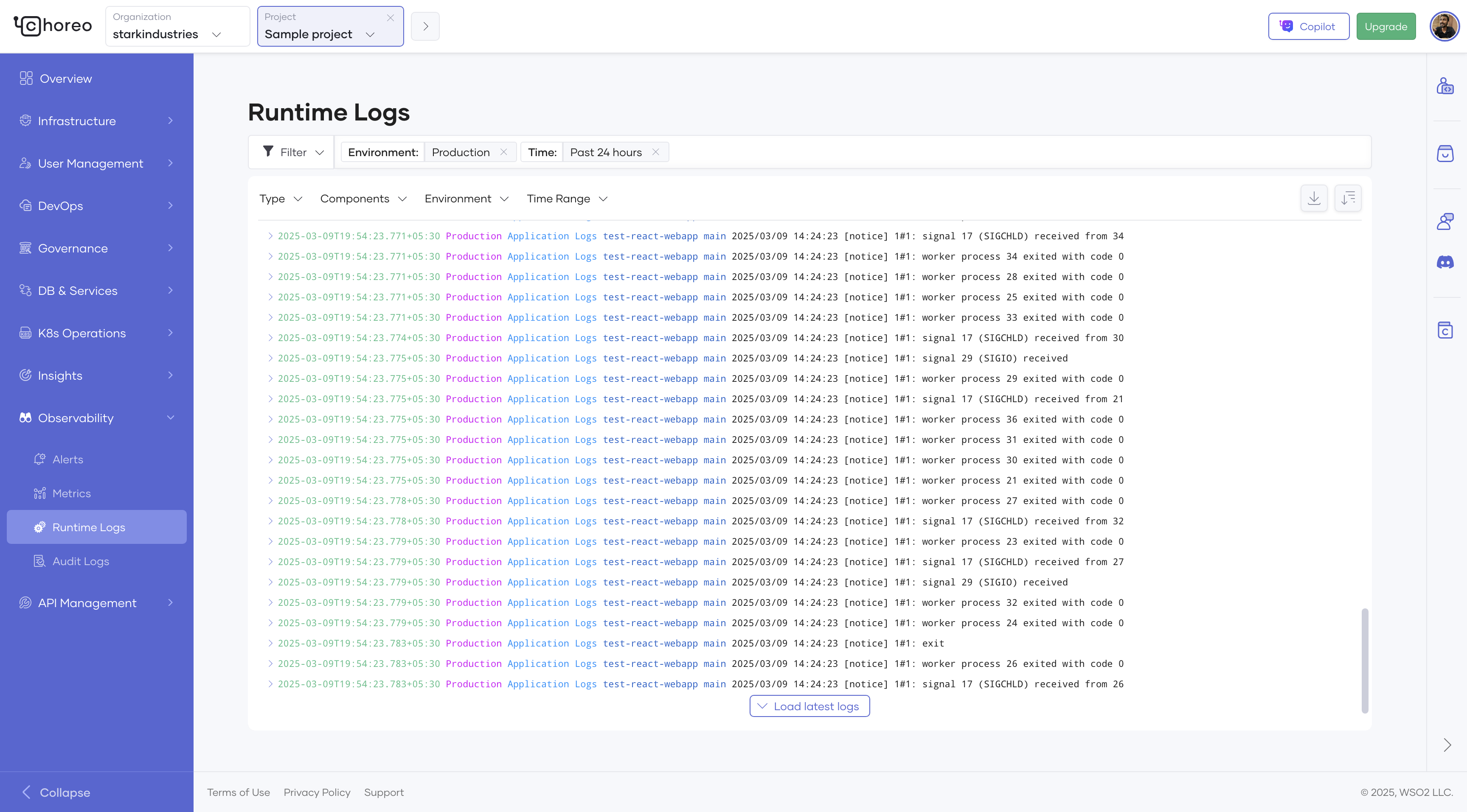 In WSO2 Developer Platform, any organization member can view runtime logs via the runtime logs page. WSO2 Developer Platform allows you to apply filters based on parameters such as log level (error, warn, info, debug), log type (application, gateway, system), and environment (development, staging, production) to simplify the debugging process.