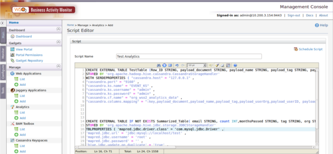 The first block of the Hive script is used to create a table in Cassendra and sync that with the events we published to Cassendra. “cassandra.columns.mapping" part is responsible for mapping the event stream to the newly created table.