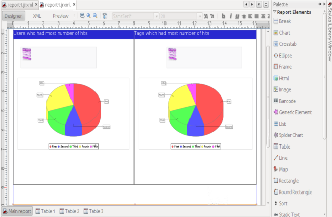 Once the data source connection is created report template can be designed by adding available report elements such as tables, charts, crosstabs, etc.