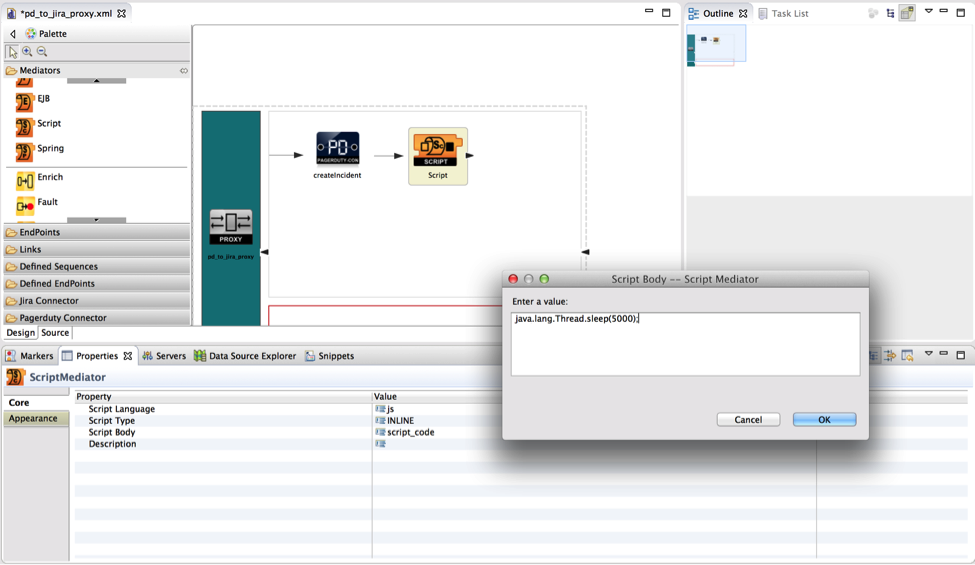 - Since it takes some time to set up the new incident in Pagerduty, you need to add a thread sleep before invoking the listIncidents method to retrieve the created incident details. For this, add a script mediator into the sequence and select the script type as “INLINE” and add the following script body in the properties palette to make the thread sleep for 5 seconds.