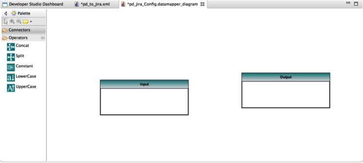- The editor shown in figure 6 will appear with input and output boxes loaded on both sides. We can load schemas for each of these to do the mapping. Mapping can be either done using operators or by creating direct links.
