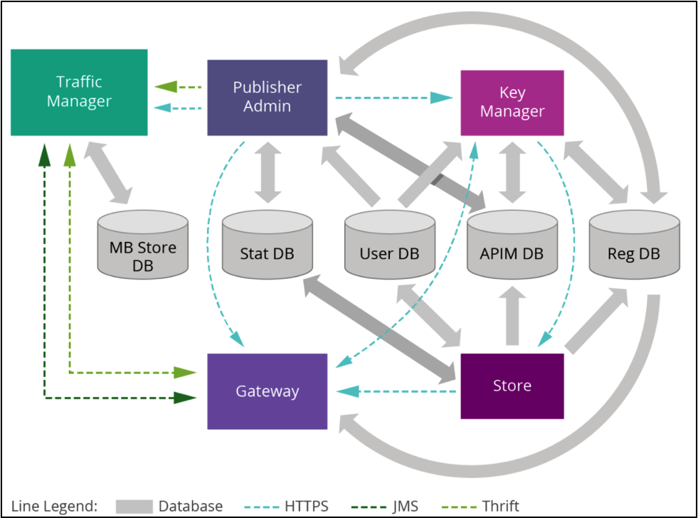 In distributed deployment, we deploy the components (API gateway, key manager, store, traffic manager and publisher) in different servers. This is one of the most common deployment patterns. In this way, there are some advantages. Since each component runs on a dedicated server, we can assign resources and fine-tune nodes according to the requirements of components (e.g. if its gateway, we can tune gateway-related configurations, such and Synapse worker threads, gateway time-out, etc.).
