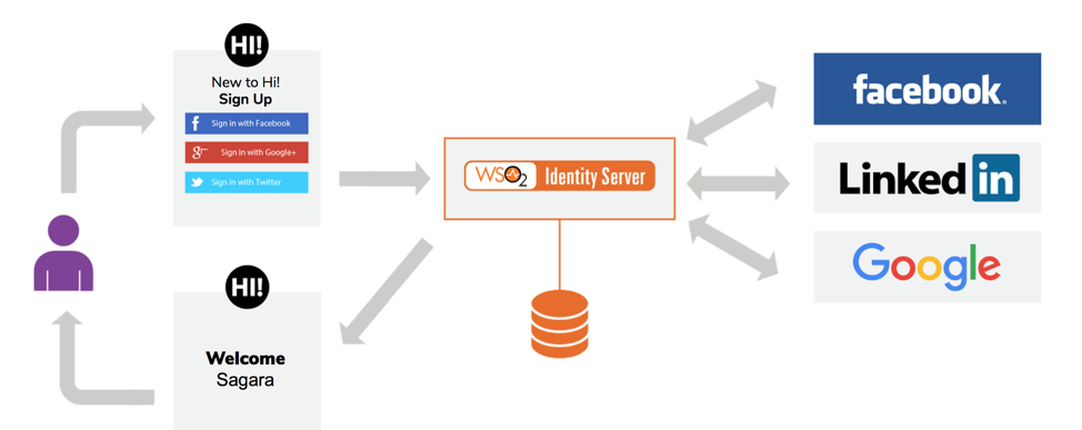 The following diagram illustrates a use case based on social networks and WSO2 Identity Server as the CIAM solution:
