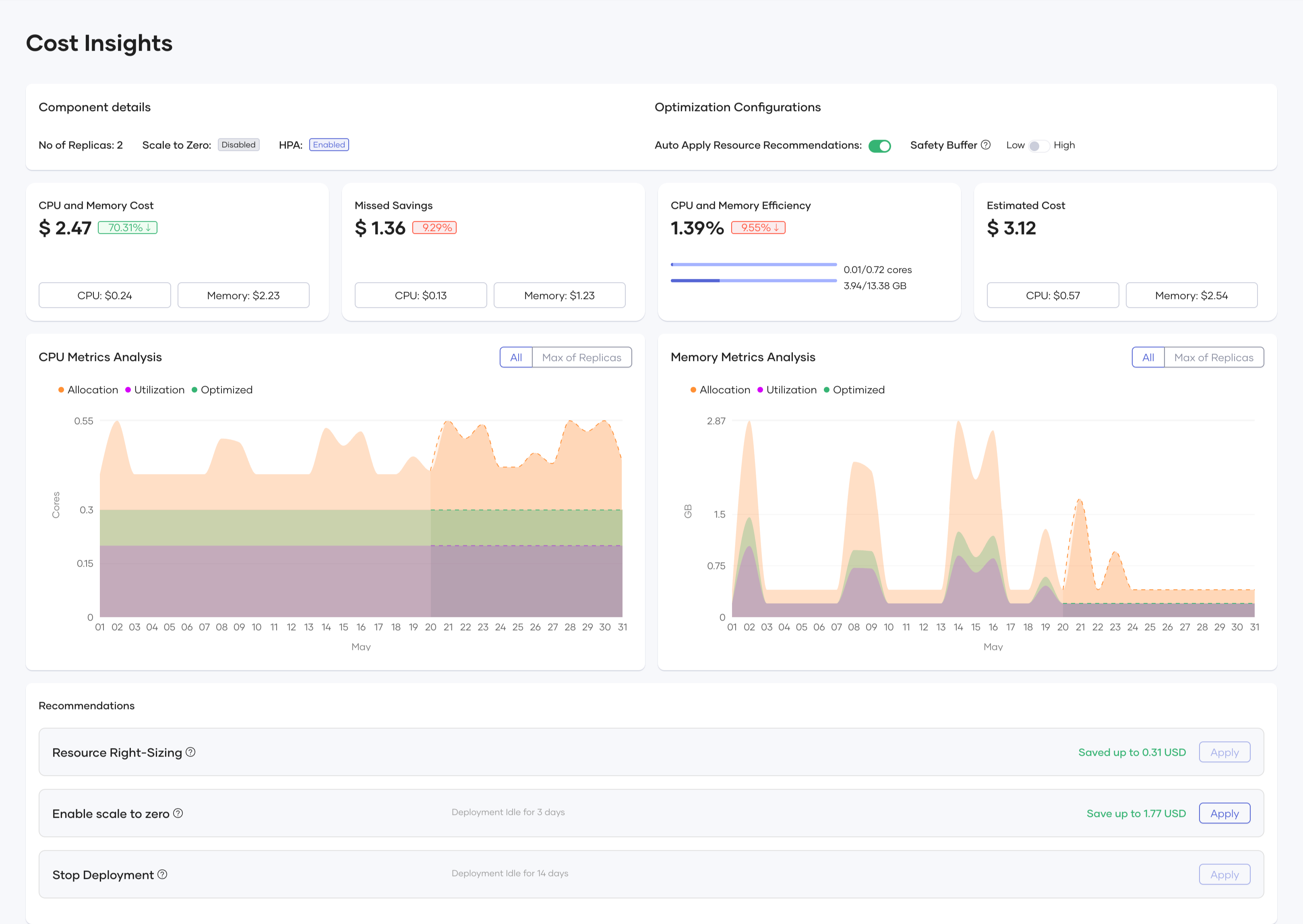 - AI-powered recommendations: Get tailored suggestions for scaling and right-sizing based on real usage, not guesswork.
