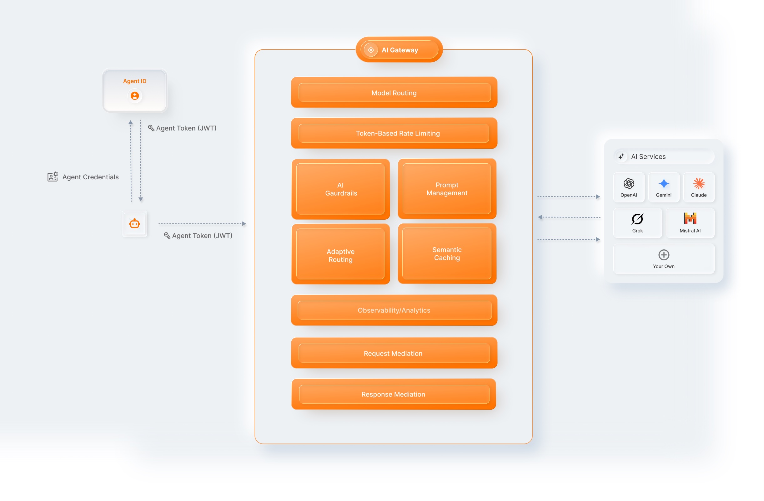 - Agent-specific access control: Restrict specific agents to particular LLMs or functionalities, preventing unauthorized access.