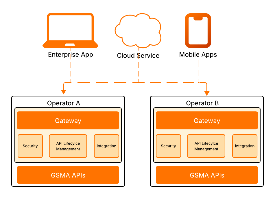 Each mobile network operator exposes standardized Open Gateway APIs through an operator-hosted API gateway, implementing common API contracts, security models, and behaviours defined by the Open Gateway framework and CAMARA specifications.