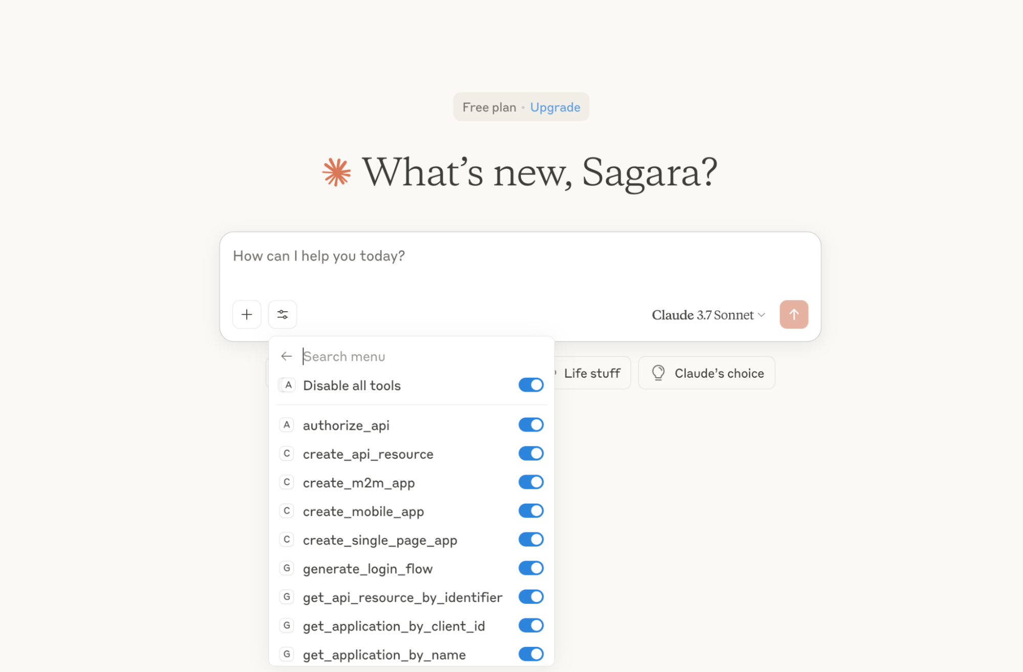 Once the Asgardeo MCP Server is configured, you should see the tool listed in your code editor—for example, as shown in the Claude Desktop screenshot.