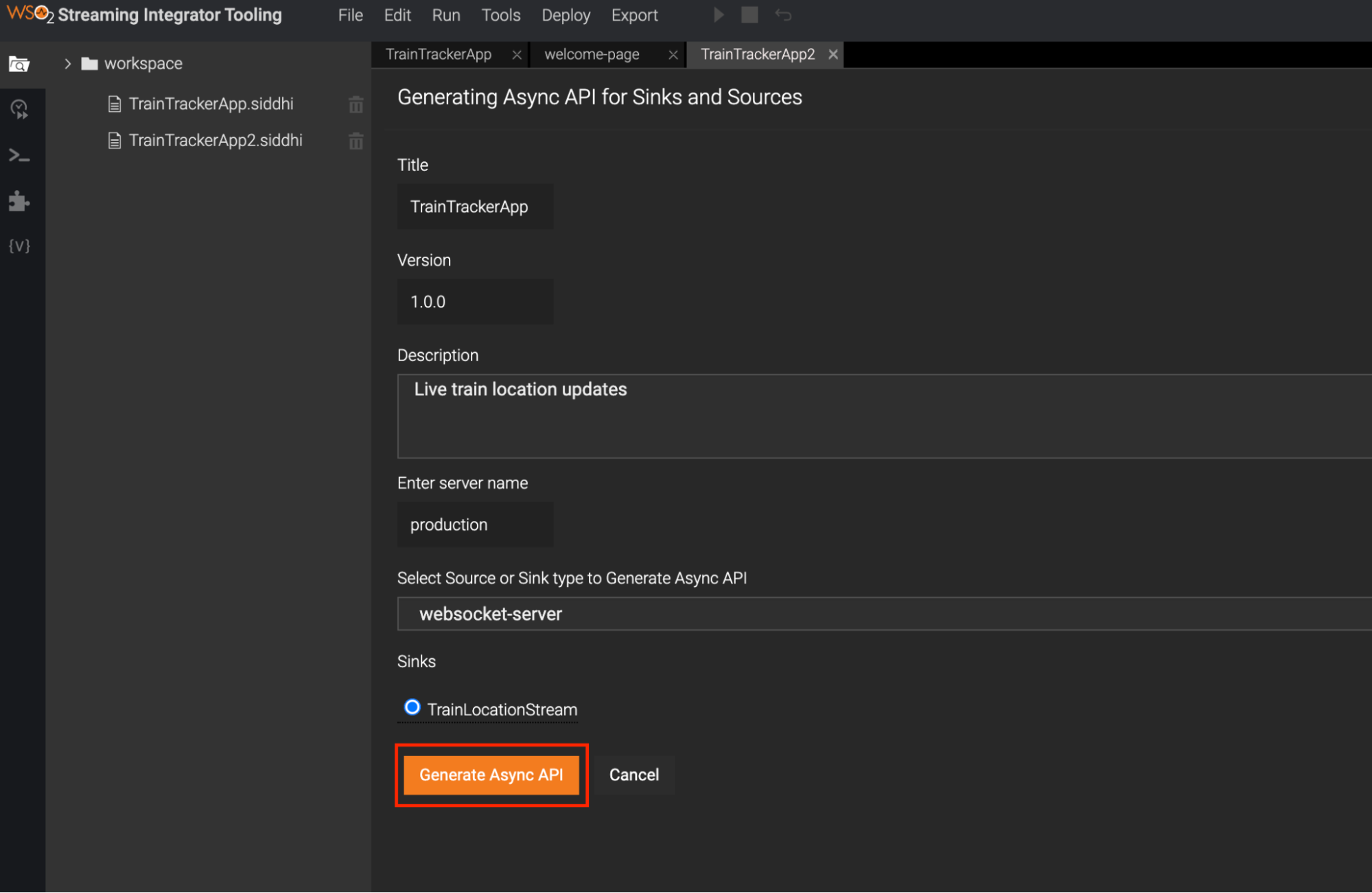 | Select Source or Sink type to generate Async API | Select websocket-server |
