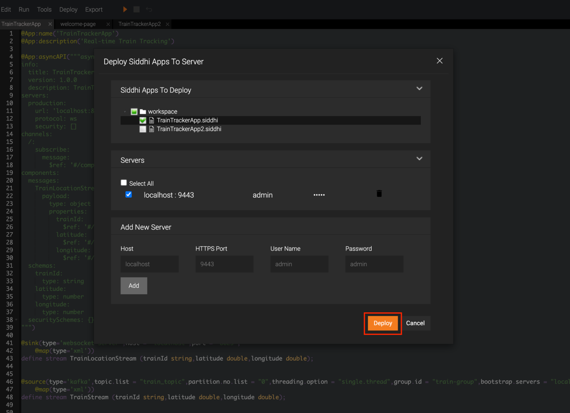 Select your Siddhi app and add the server of the Streaming Integrator Server, and click Deploy.