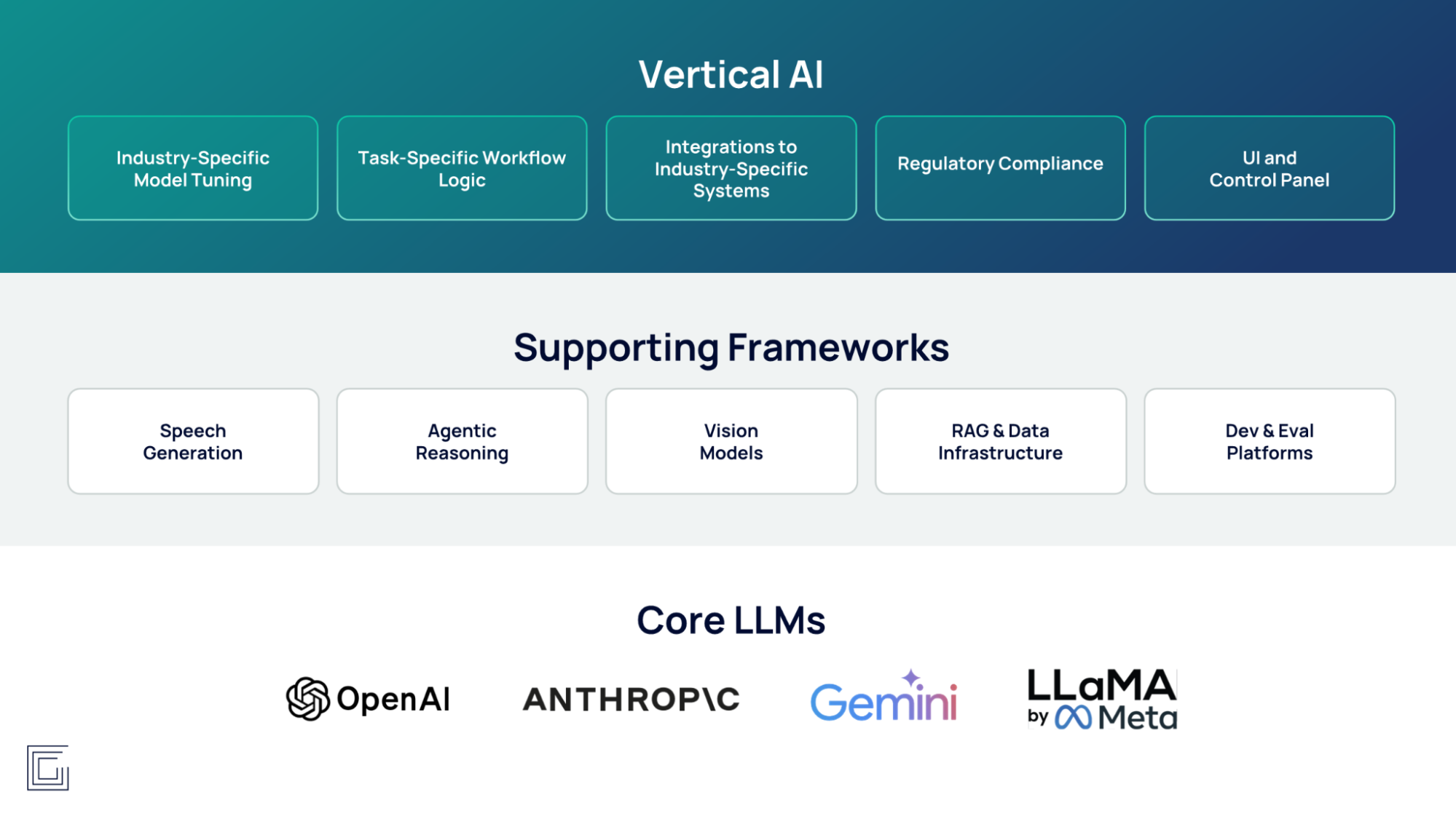 - Foundational LLMs: Horizontal models from OpenAI, Anthropic, Google, Meta, etc.
