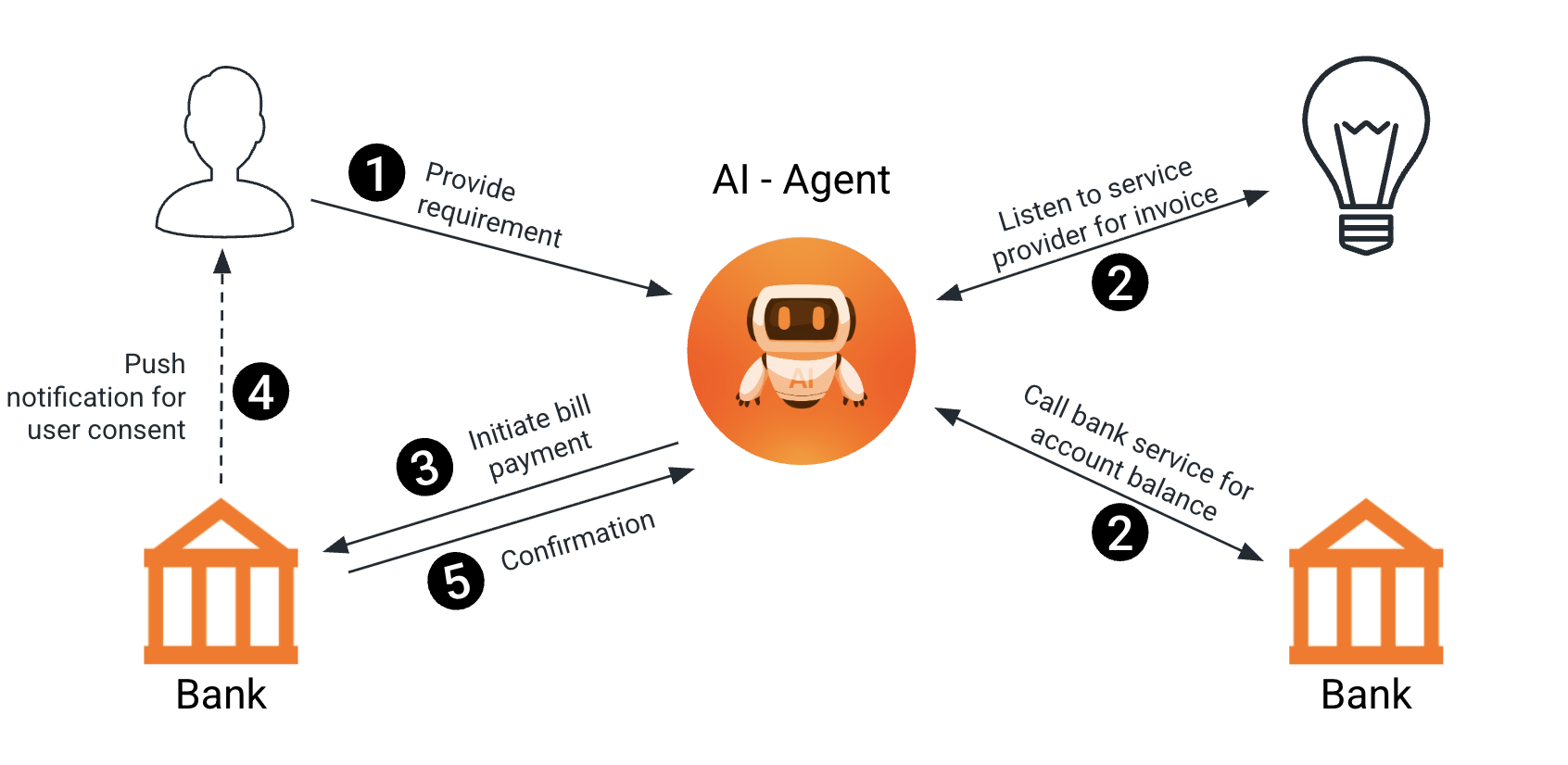 With open banking and service provider APIs the agent can monitor bill status and account transactions. To perform a payment, the agent can initiate a bank-backed authentication flow with decoupled (Async) authentication (e.g., CIBA (Client Initiated Back-Channel Authentication) to request user approval and obtain a token to initiate the payment. This enables reliable, auditable automation while keeping the user in the loop for authorization.