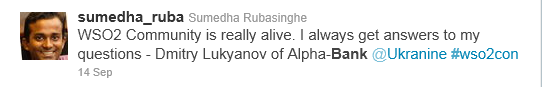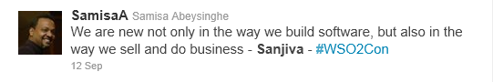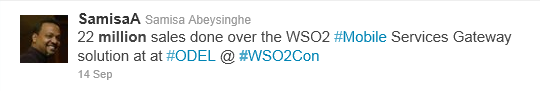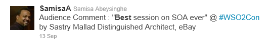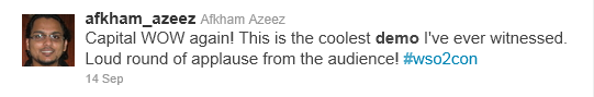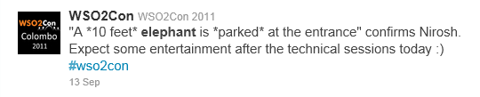 And ripples of the event went out well beyond Water’s Edge – hundreds of sessions were viewed live through the simultaneous webcast (recordings will be available at some point.) Facebook pictures are still popping up from dozens of attendees (what was the last tech conference you went to that included elephant rides?) And twitter was going nuts - #WSO2con was used over 1000 times, and broke the top 100 of trending topics during the conference. So I’d thought I’d share a few highlights as expressed through some of my favorite tweets: