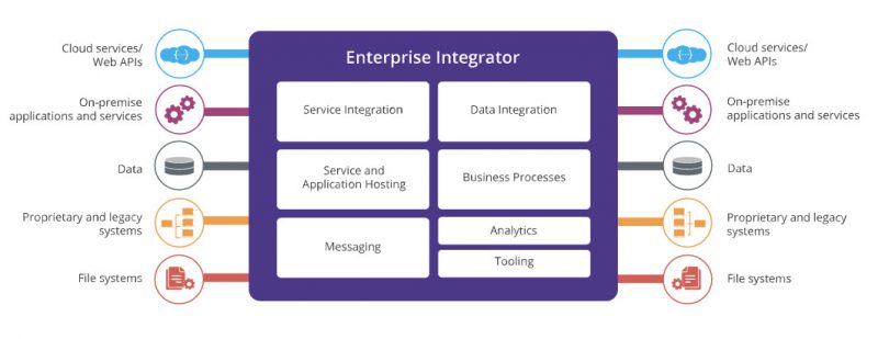 EI 6.0 contains service integration or service bus functionality. It has data integration, service, and app hosting, messaging, business processes, analytic and tooling. It also contains connectors which enable you to connect to external services and systems.